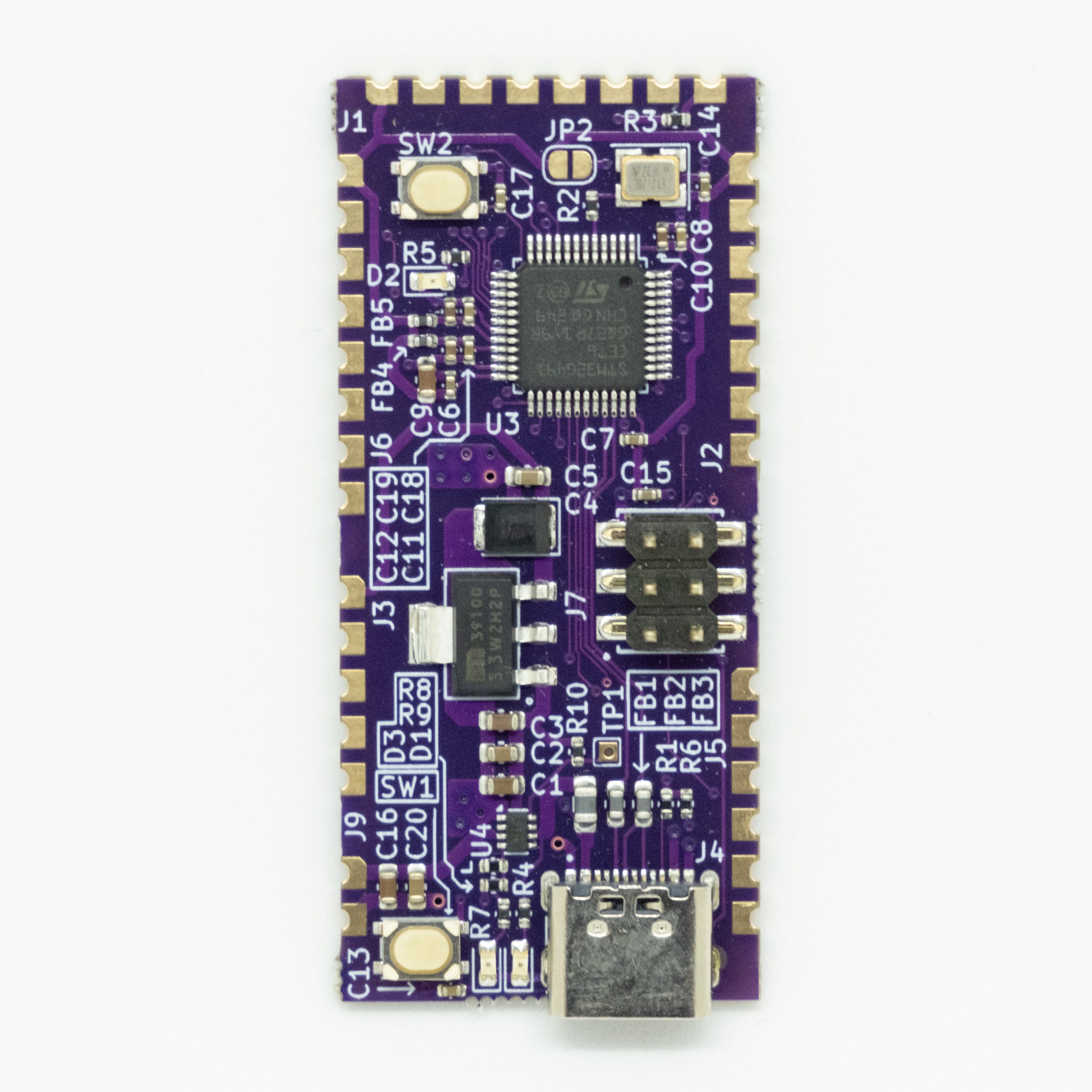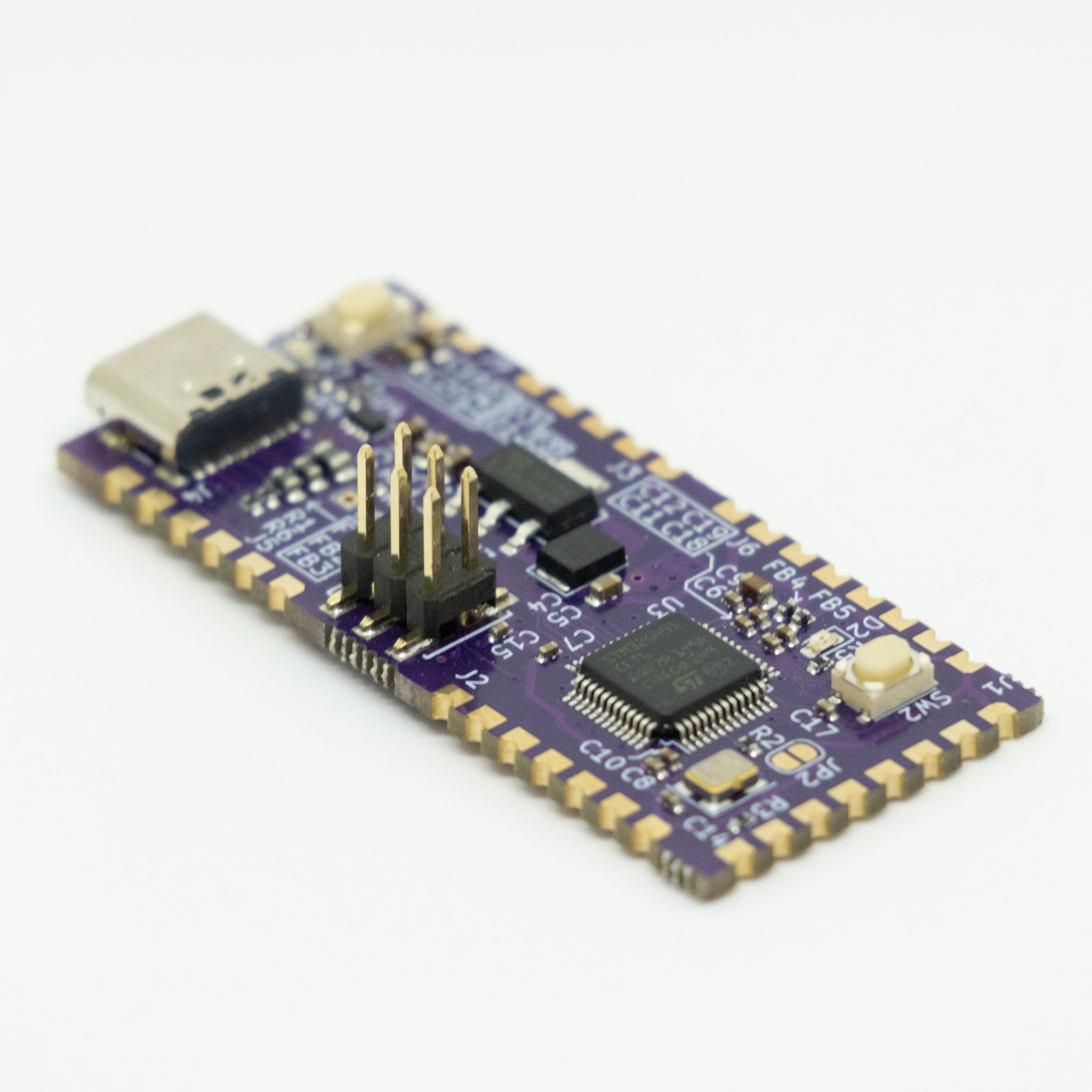 比較的小さなサイズ(50.25×22.86mm)でありながら、豊富なアナログ入力とSAIやQSPIなどのペリフェラル、そしてUSBフルスピードが利用出来ることから、USBキーボードやMIDIコントローラー、簡単なオーディオデバイスの開発が可能です。