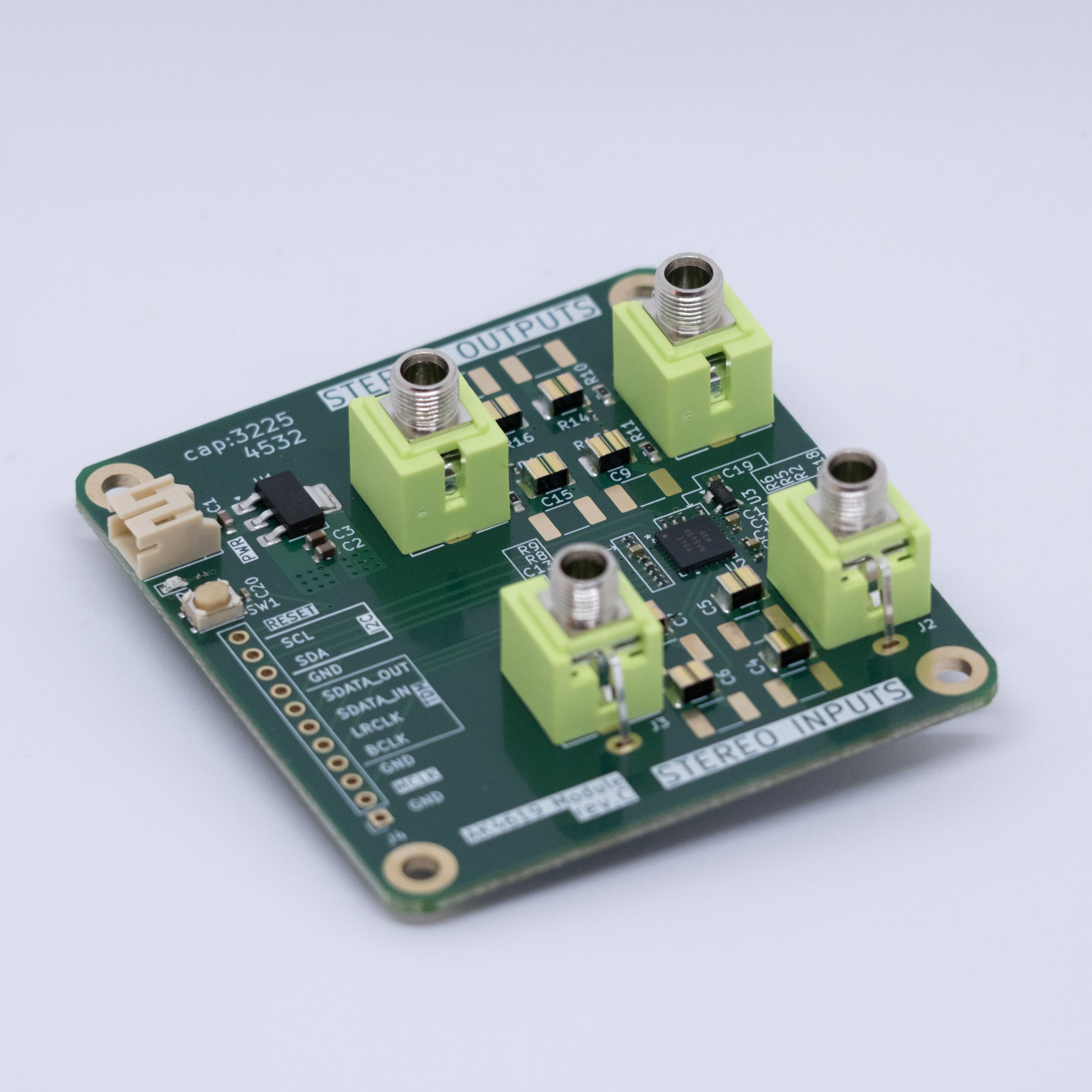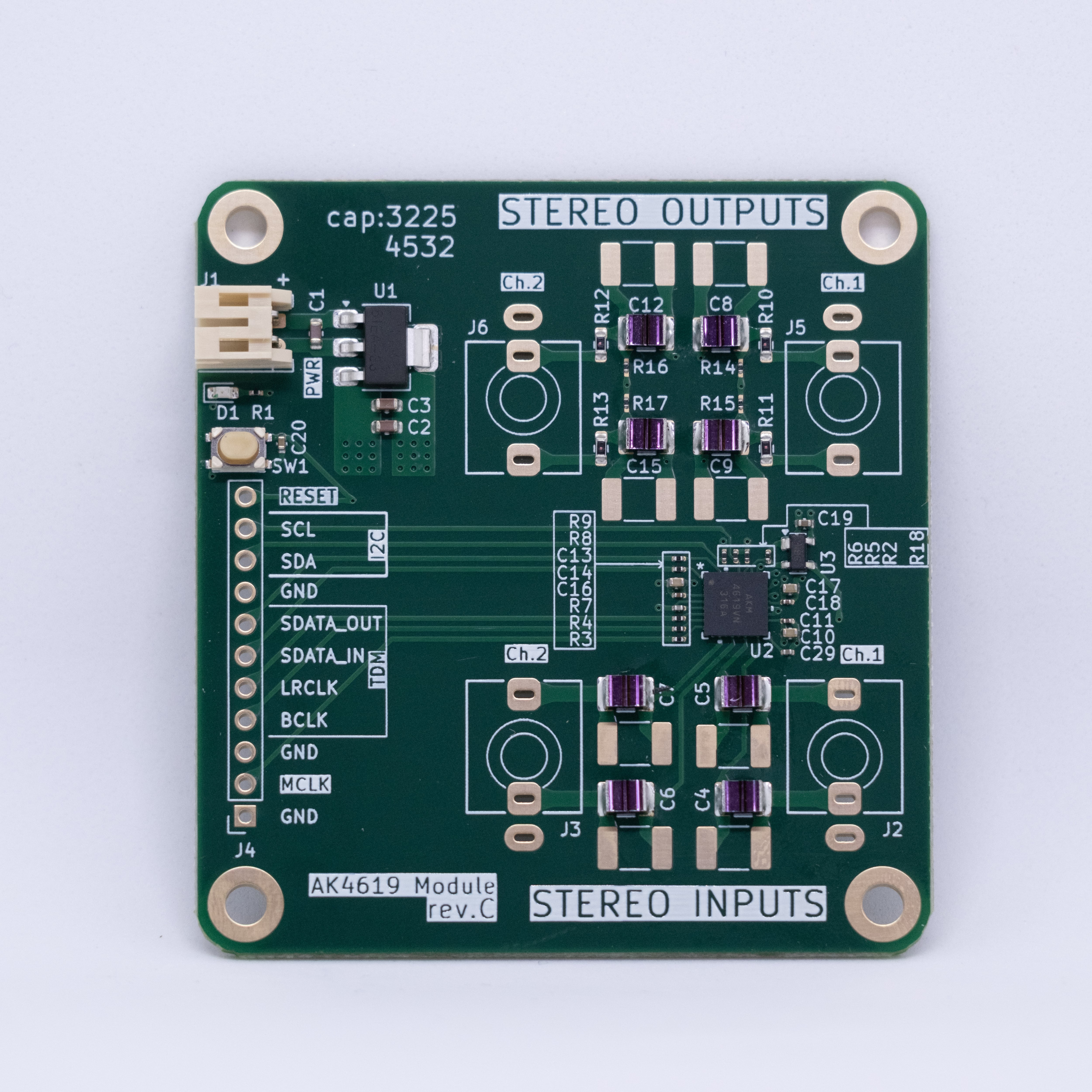 本製品は旭化成製のオーディオCODEC「AK4619VN」を搭載したオーディオ・モジュール基板です。最大192kHzのサンプルレートに対応し、入出力数はステレオで2in/2out(モノラルで4in/4out)なので、小型のオーディオミキサーなどを開発するのに最適です。