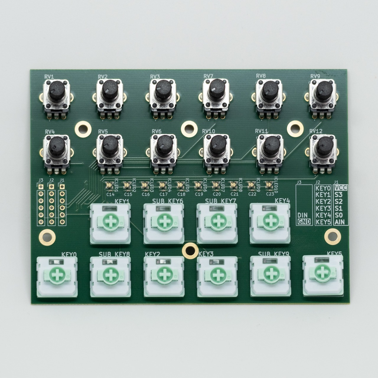 本製品は12個のボリューム(10kΩ、Bカーブ)と10個の磁気スイッチ(Gateron Low Profile Magnetic Jade Pro HE)、そして10個のRGB LEDを搭載したMIDIコントローラーなどのインターフェースを試作するのに最適なモジュールです。